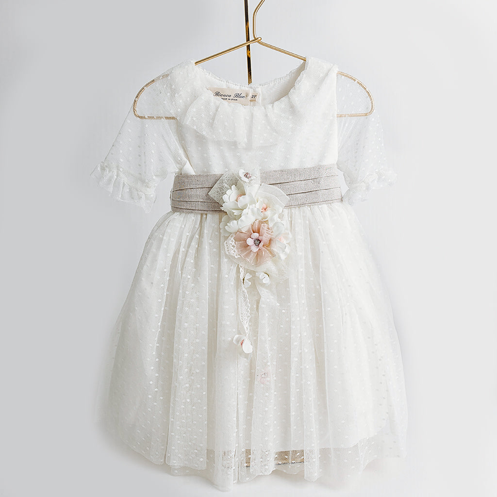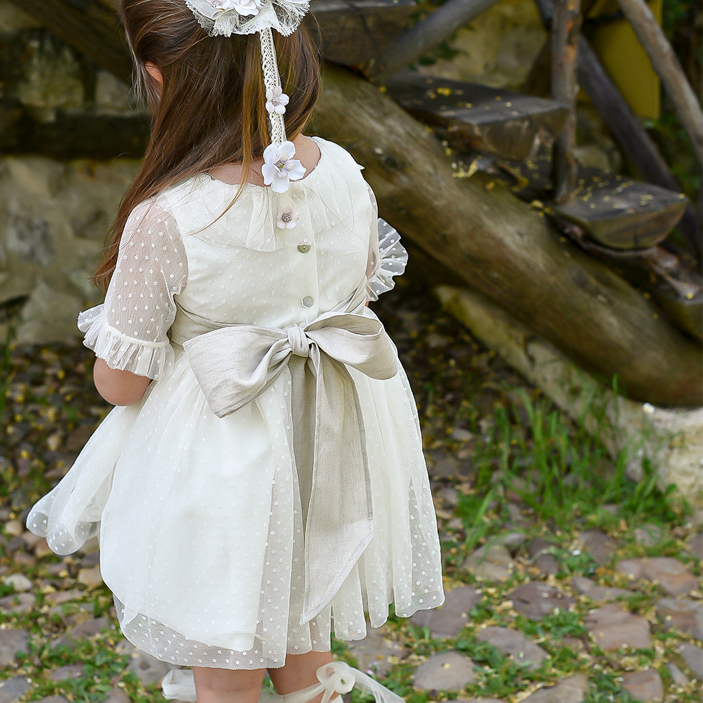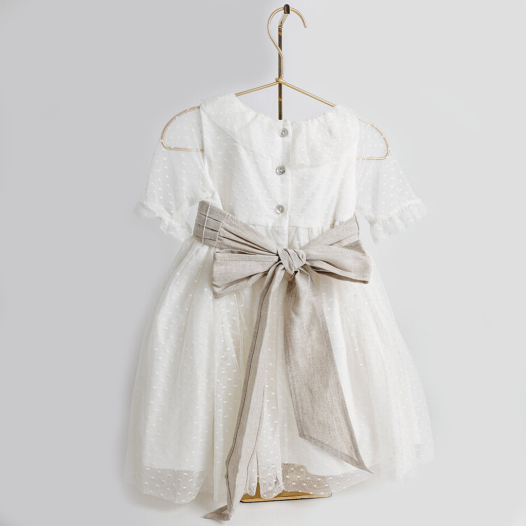 The Tulle and Linen Flower-Embellished Dress for Girls is a charming garment for little girls, crafted sustainably by artisans in Spain.